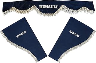 AutoCommerse Lot de 3 rideaux cantonnière en satin avec pompons blancs pour pare-brise avant + fenêtres latérales pour camions Magnum Kerax série Premium, poids lourds, bleu
