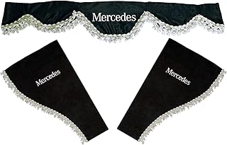 AutoCommerse Lot de 3 rideaux cantonnière satiné avec pompons blancs pare-brise avant + fenêtres latérales pour camions Actros Atego Axor Arocs série camions poids lourds Noir